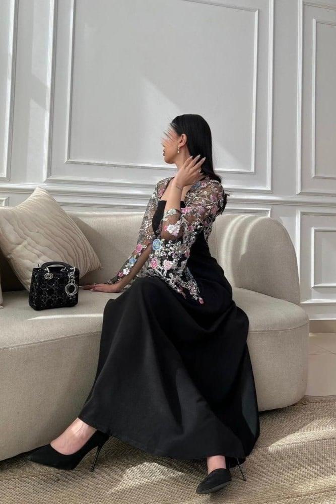 فستان أنيق بقصة مستقيمة ولمسة فاخرة، يتميز بأكمام شفافة مزينة بتطريزات زهرية تضيف لمسة رومانسية ناعمة.