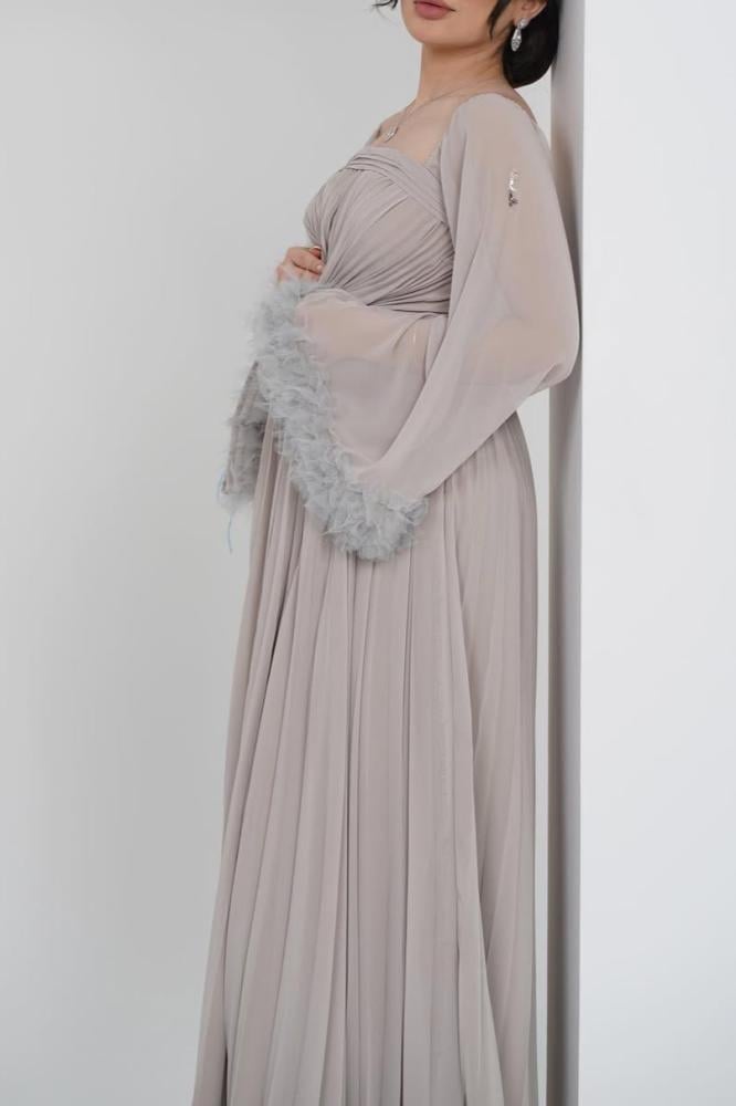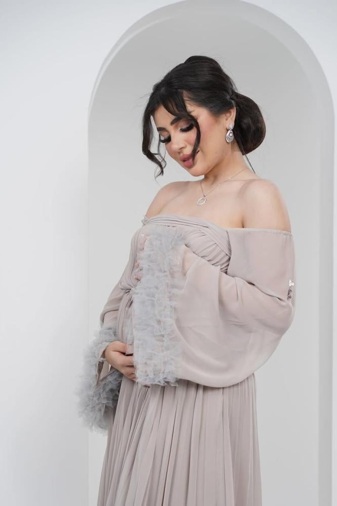إطلالة أنيقة ومريحة في آنٍ واحد مع هذا الفستان المصمم خصيصًا للأمهات المنتظرات. يتميز بقصة انسيابية تمنحك الحرية والراحة، مع أكمام شفافة مزينة بتفاصيل أنثوية ناعمة. تصميمه الراقي يجعله مثاليًا للسهرات والمناسبات الخاصة، حيث يجمع بين الأناقة والعملية بأسلوب فريد.