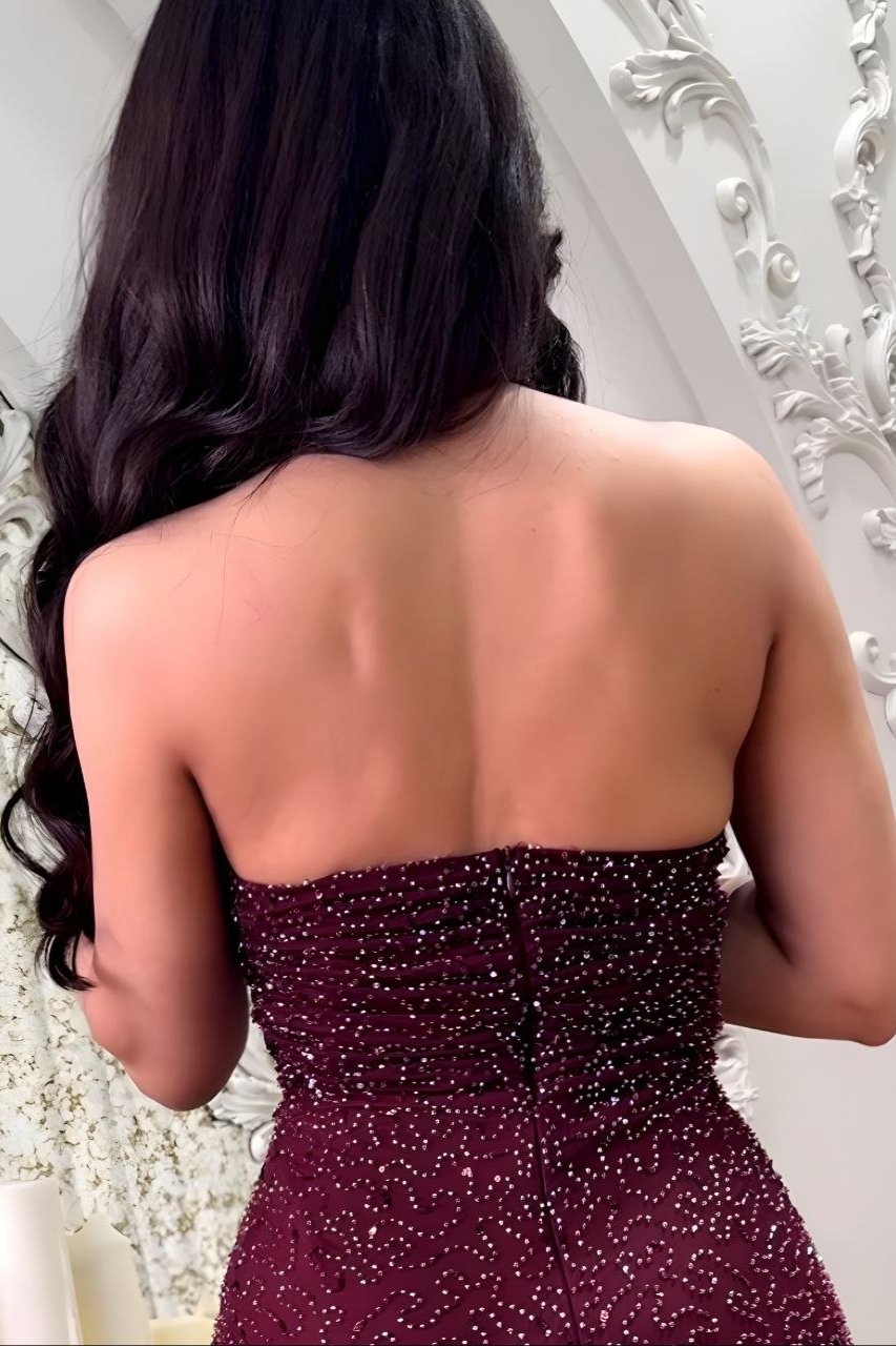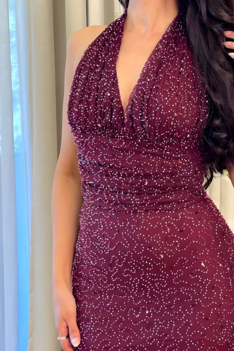 فستان سهرة عنابي ضيق بفتحة صدر وفتحة جانبية