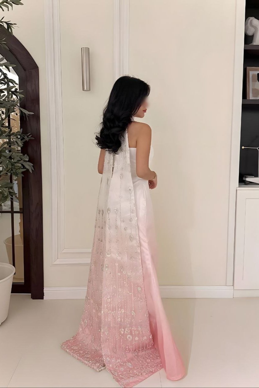 فستان سهرة بتصميم أومبريه متدرج من الأبيض إلى الوردي الفاتح