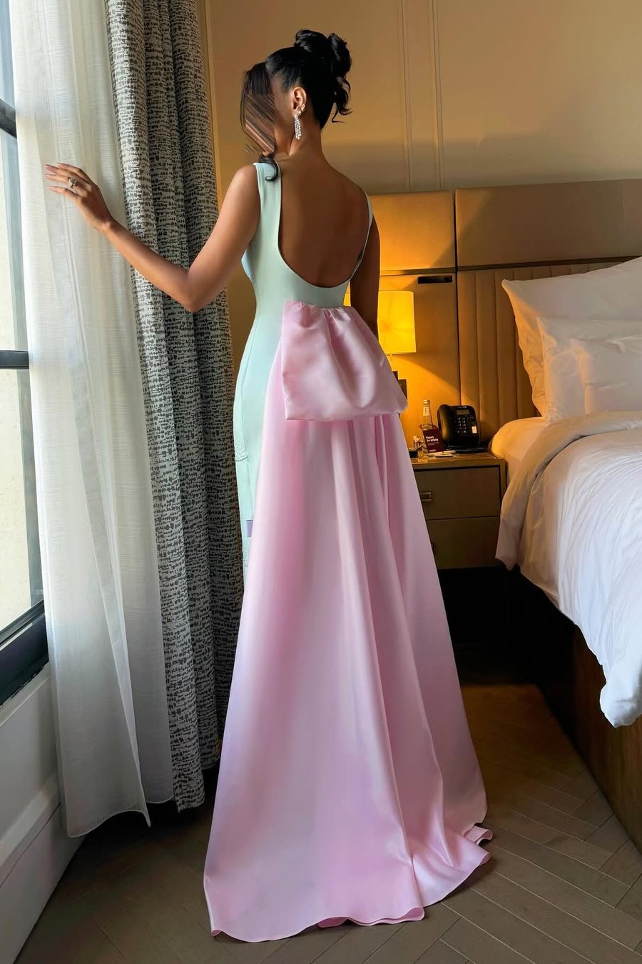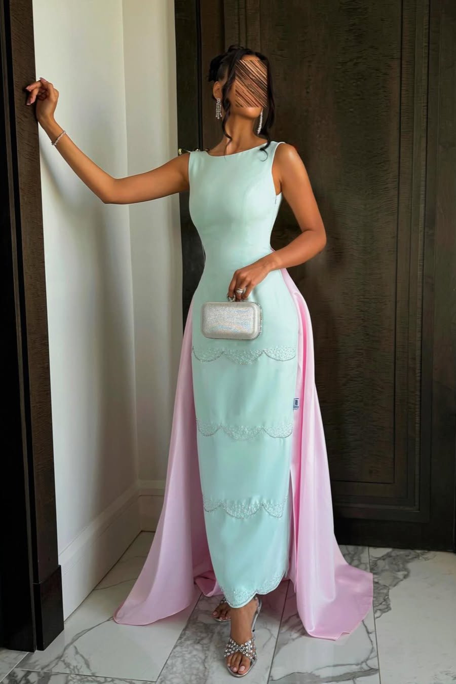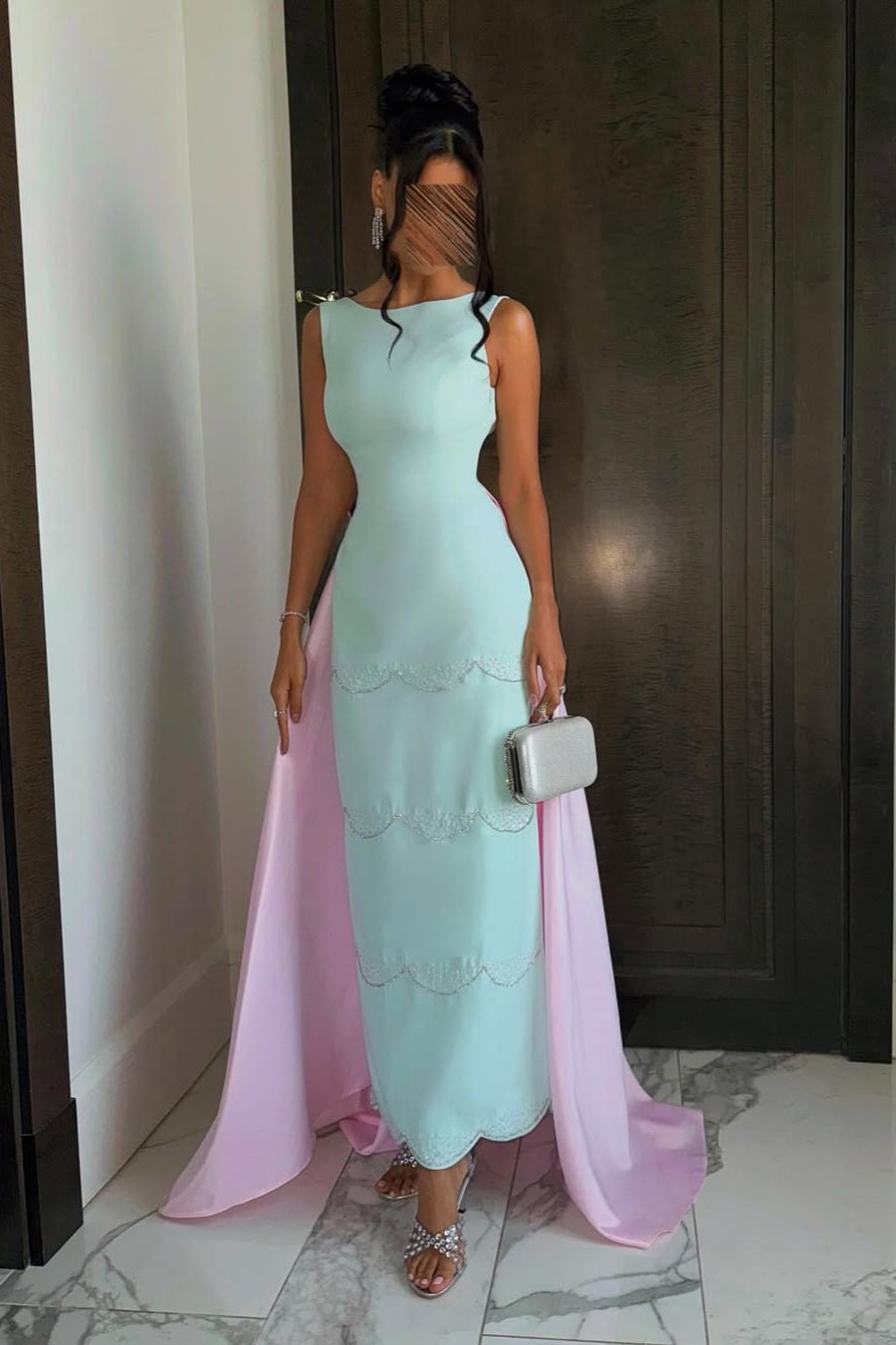 فستان سهرة طويل أزرق باستيل فاتح مع ذيل وردي ملكي وتطريز ناعم بدون أكمام