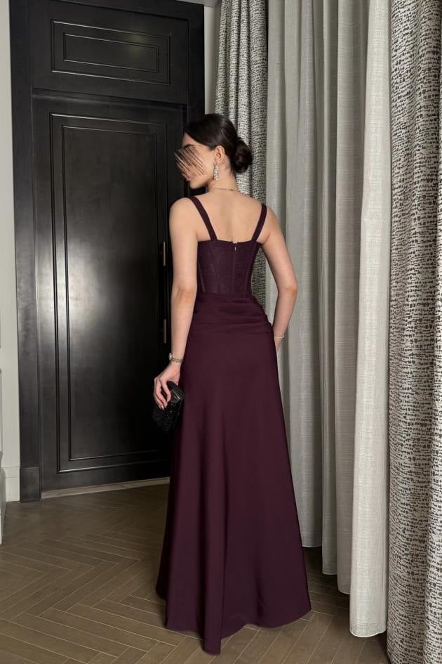 فستان سهرة طويل بقصة كورسيه وفتحة أمامية أنيقة