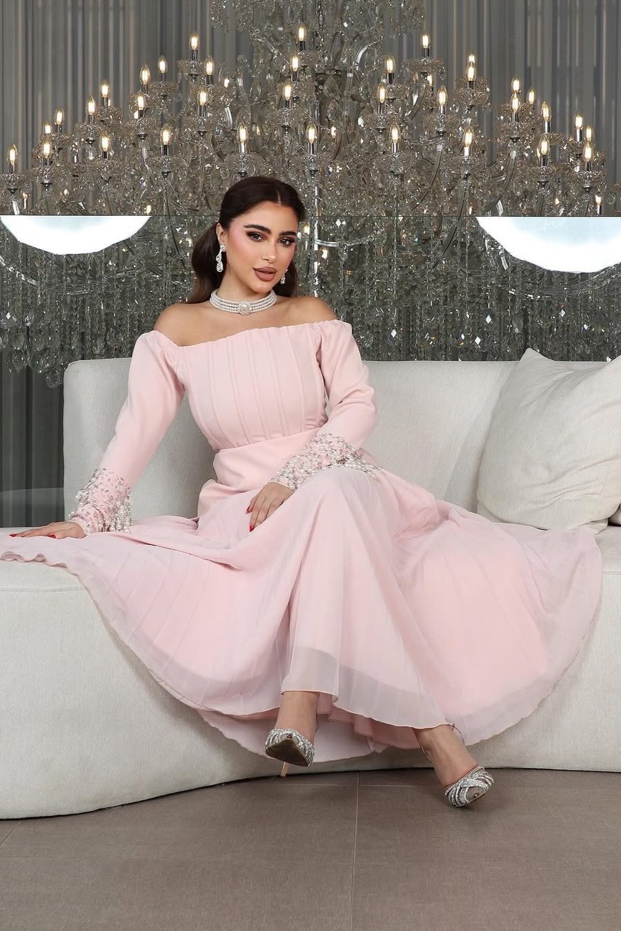 فستان سهرة وردي فاتح مطرز بأكمام أوف شولدر ملكي