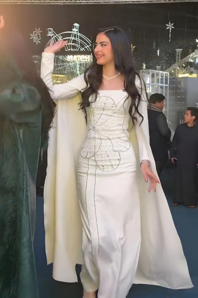 إطلالة ساحرة بلمسة ملكية مع هذا الفستان الأبيض الفاخر المصمم بأكمام طويلة وكاب منسدل يضفي لمسة من الفخامة.