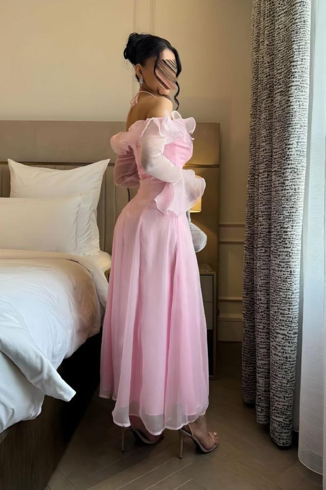 فستان أنثوي بتصميم أنيق يتميز بكتفين مكشوفين مع تفاصيل ربط ناعمة عند العنق، وأكمام شفافة تضيف لمسة من الرقي.
