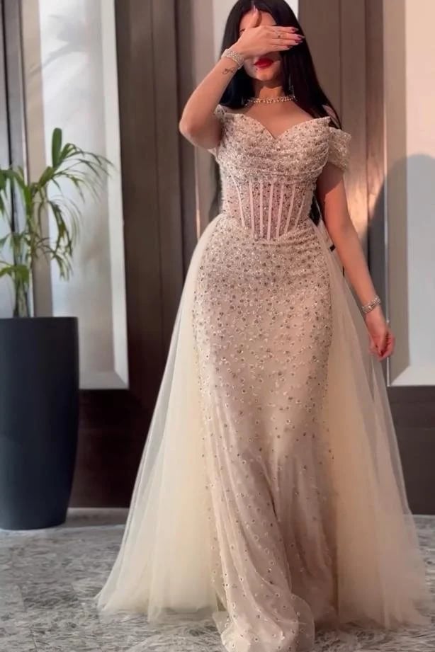 فستان سهرة أوف شولدر مطرز بتفاصيل كورسيه