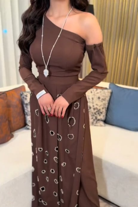 جمبسوت بني طويل أوف شولدر مطرز بكريستال