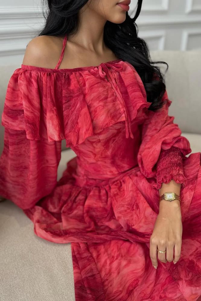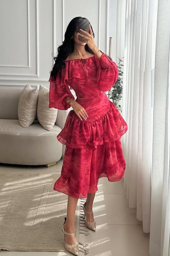 مع تفاصيل كشكش عند الخصر تضيف لمسة من الحيوية والتميز. خيار مثالي للمناسبات النهارية والسهرات الراقية.