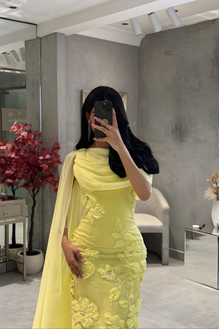 فستان سهرة أصفر ليموني طويل مورد مع كاب شيفون