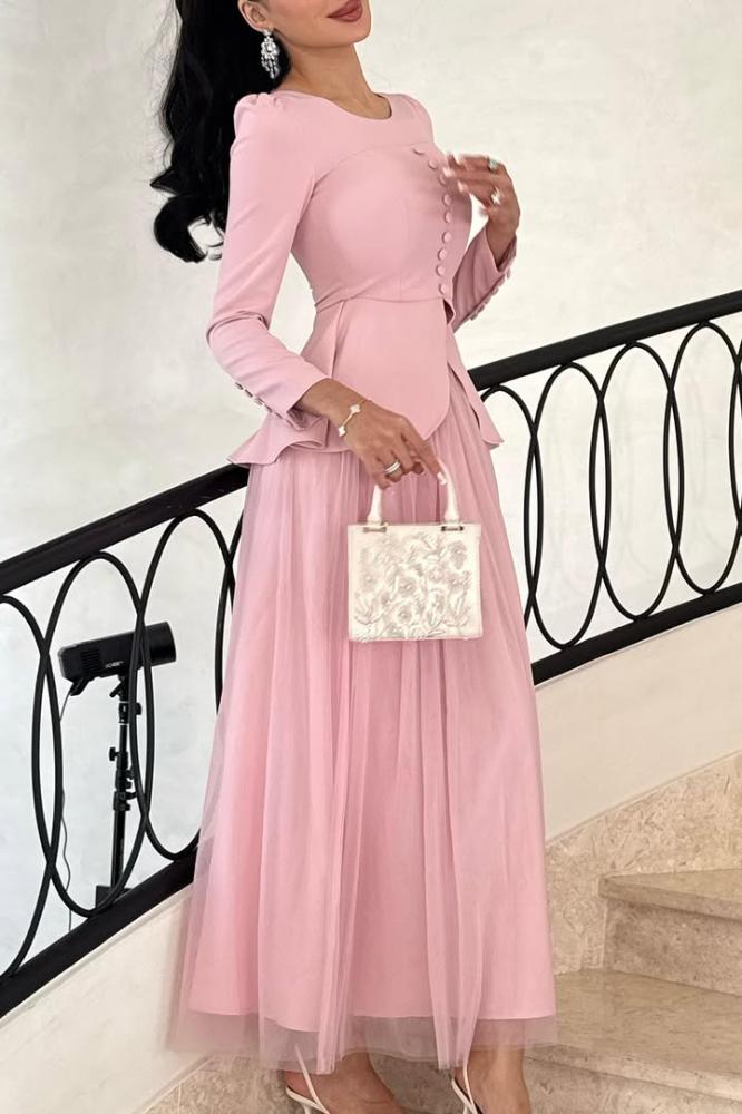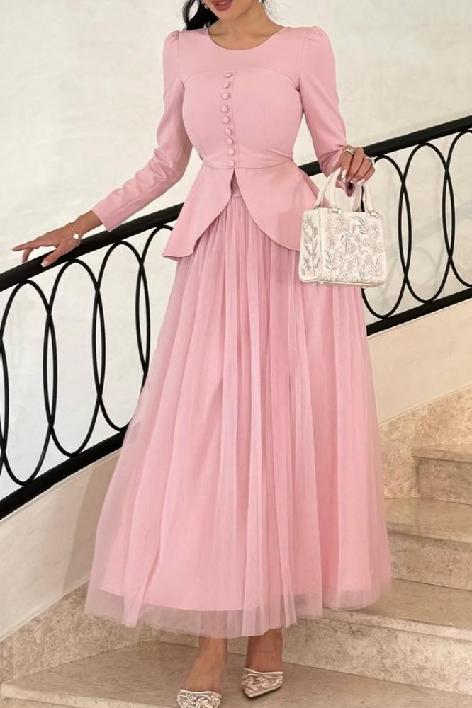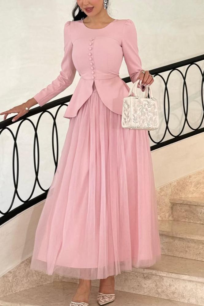 فستان راقٍ بتصميم كلاسيكي يجمع بين الأناقة والرقي، يتميز بجزء علوي بتصميم مع أزرار أنيقة تمنحه لمسة ملكية،
