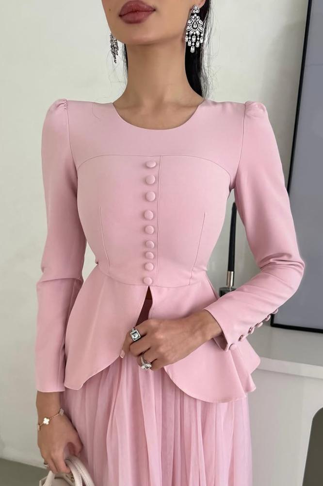 مع تنورة واسعة منسابة تضيف لمسة أنثوية راقية. الأكمام الطويلة والقصة الفريدة تجعله خياراً مثالياً للمناسبات الفاخرة والإطلالات المحتشمة.