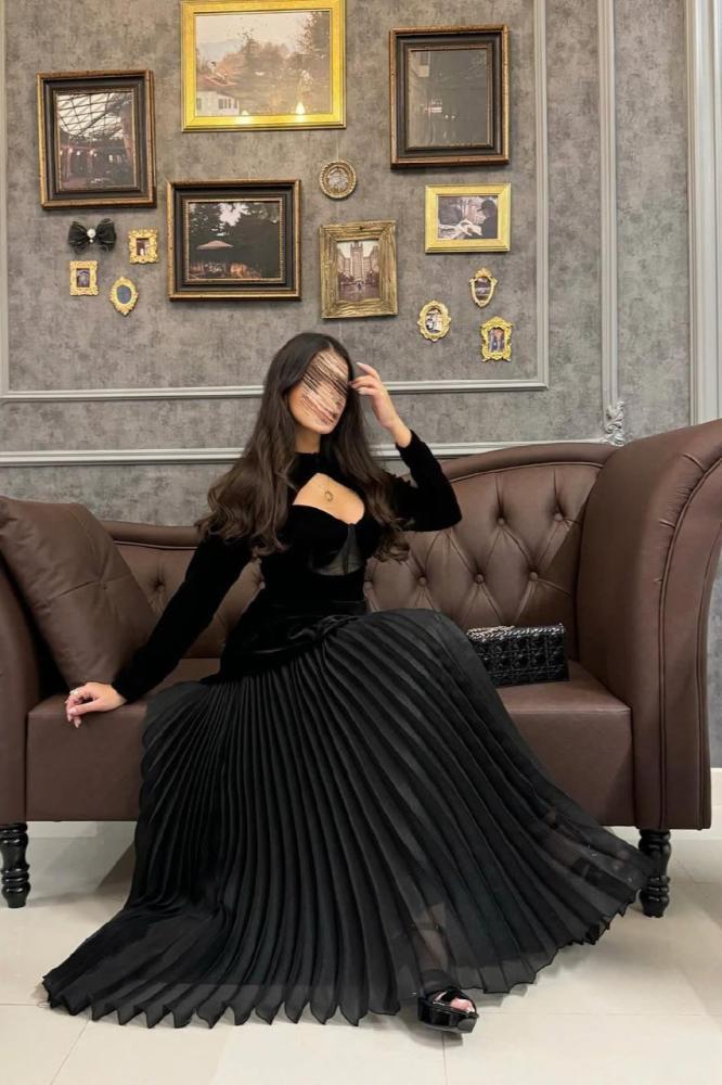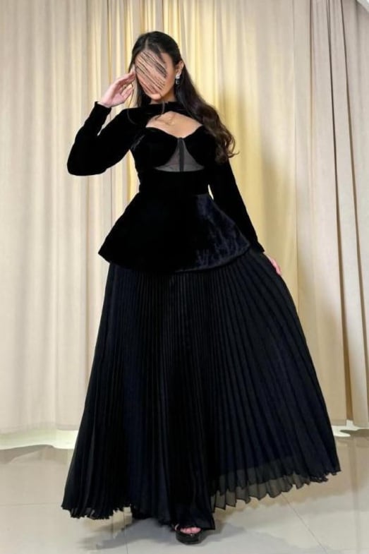 تصميم أنيق باللون الأسود يجمع بين الفخامة والرقي. يأتي الفستان بأكمام طويلة مع قصة ضيقة عند الخصر تعزز من جمال القوام،