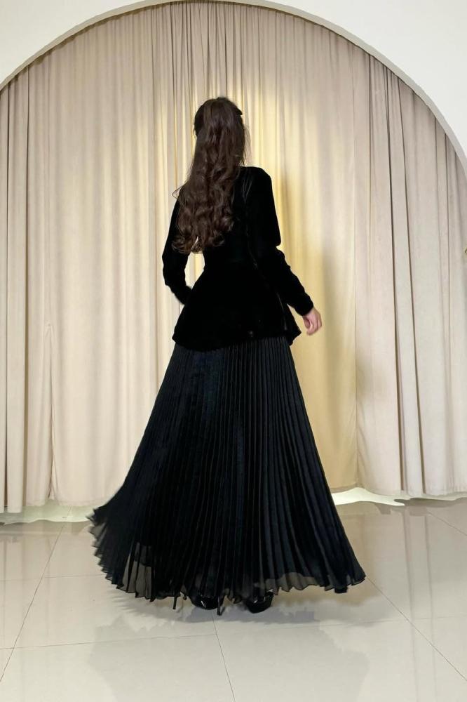 بينما تضيف التنورة البليسيه المنسدلة لمسة أنثوية ساحرة. التفاصيل العلوية المميزة تمنح الفستان طابعًا عصريًا يناسب المناسبات الفاخرة والسهرات.