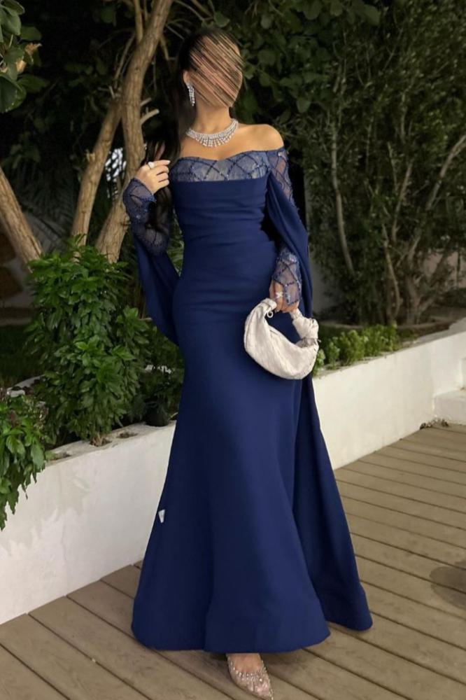 فستان طويل باللون الأزرق الداكن بتصميم راقٍ يناسب السهرات والمناسبات الفاخرة. يتميز بأكمام شفافة مطرزة تضيف لمسة جذابة،