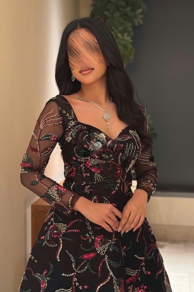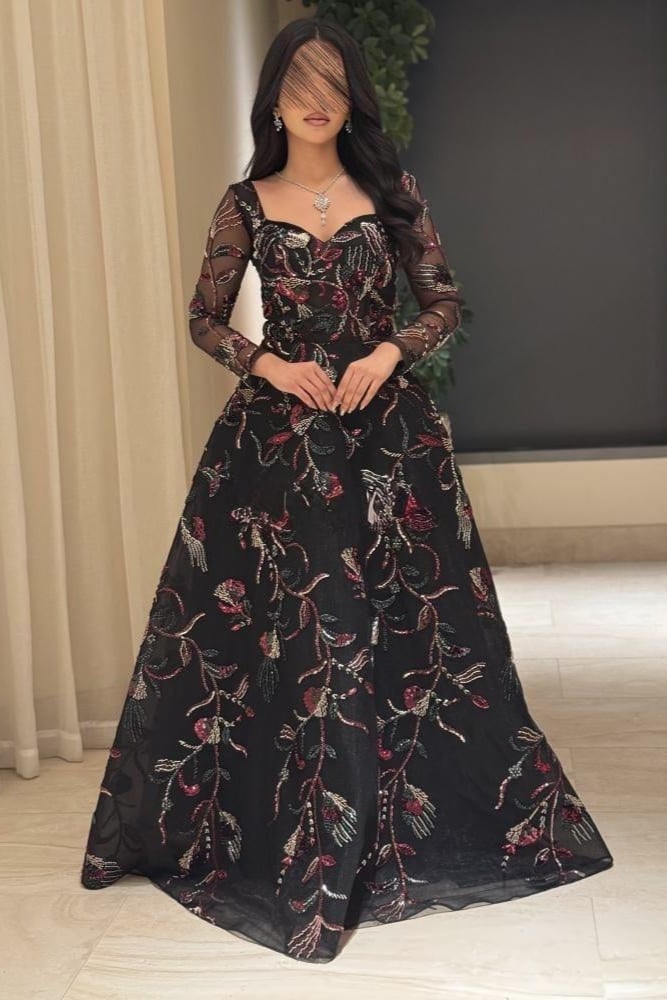 فستان سهرة أسود مطرز طويل بأكمام شفافة