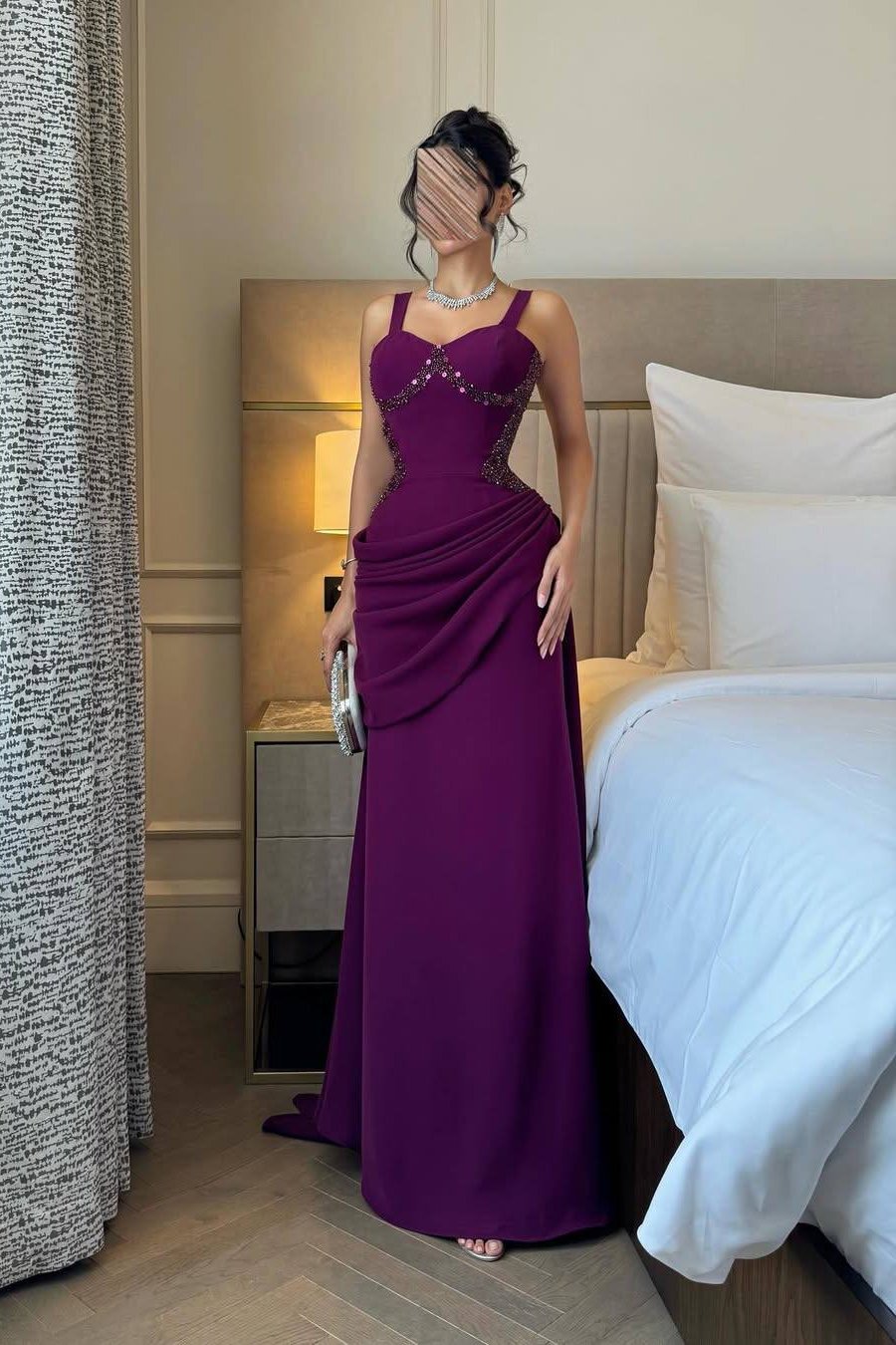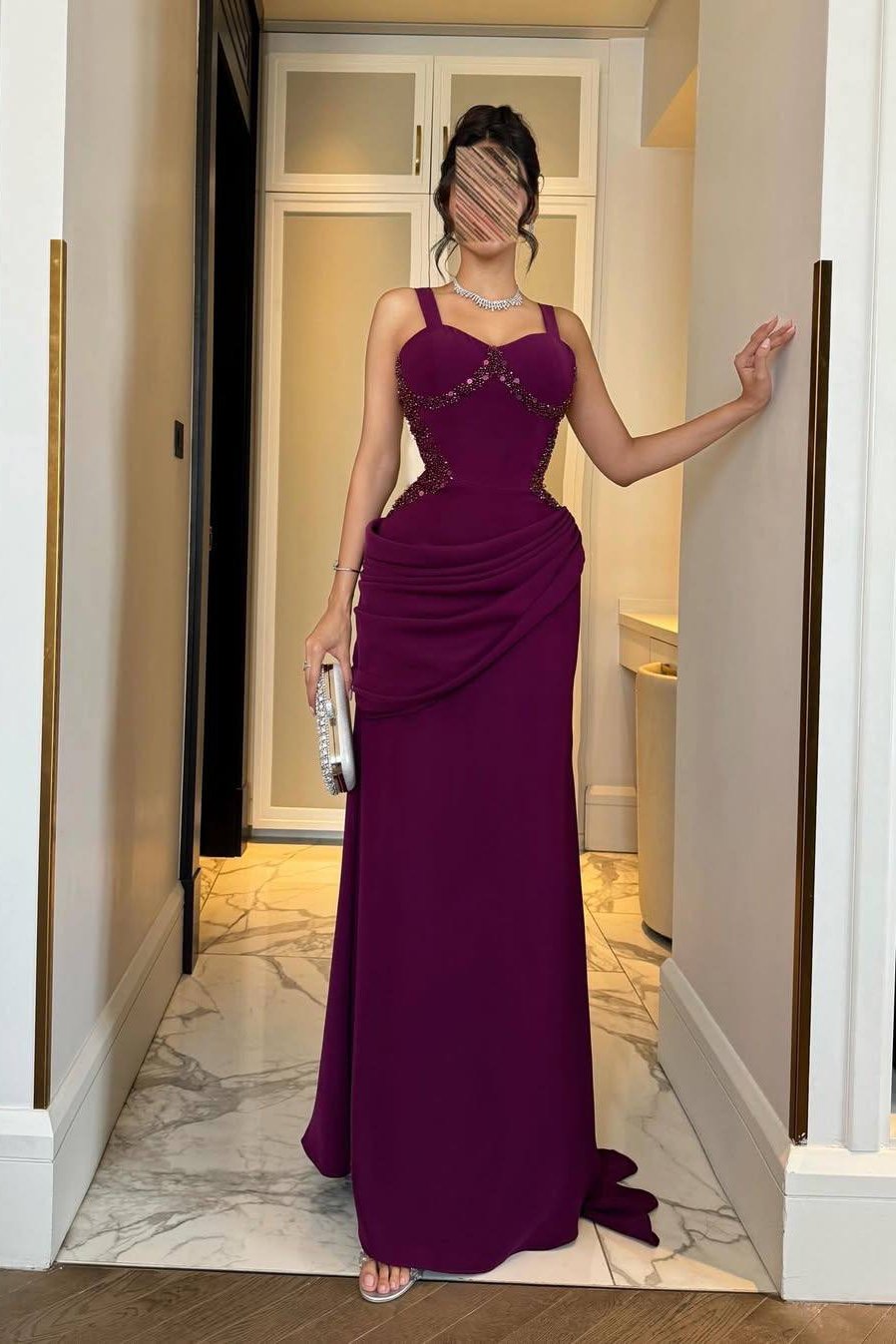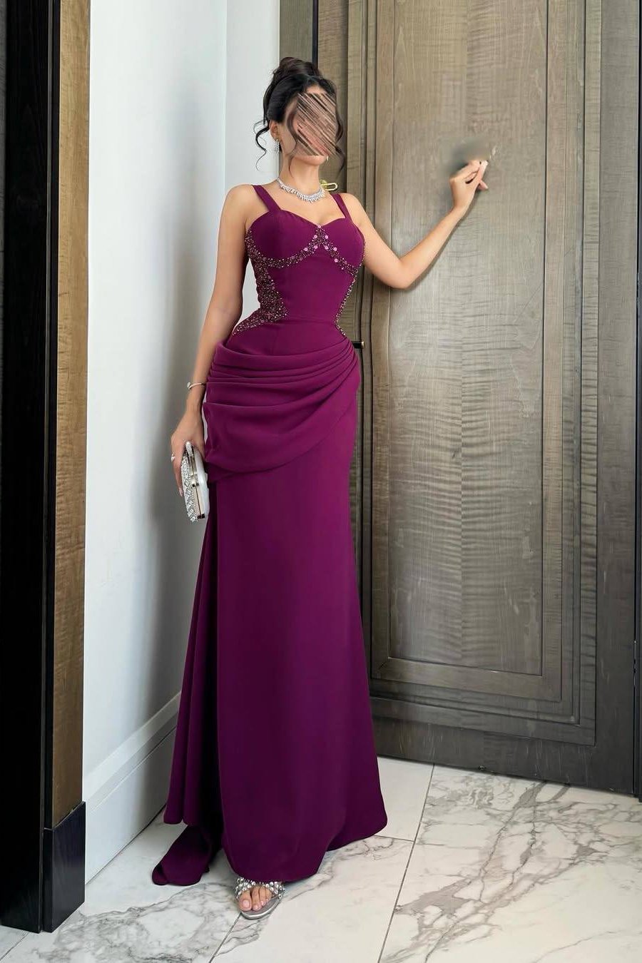 فستان سهرة طويل بحمالات عريضة مع تطريز لامع وذيل