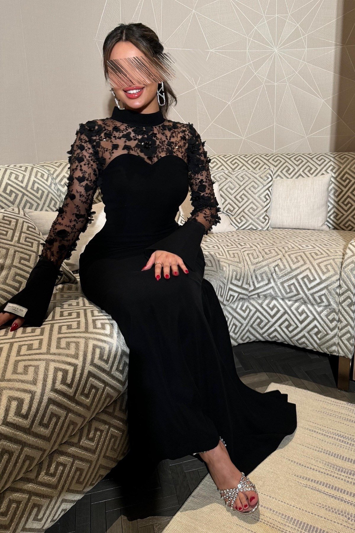 فستان أسود طويل دانتيل بأكمام واسعة شفافة
