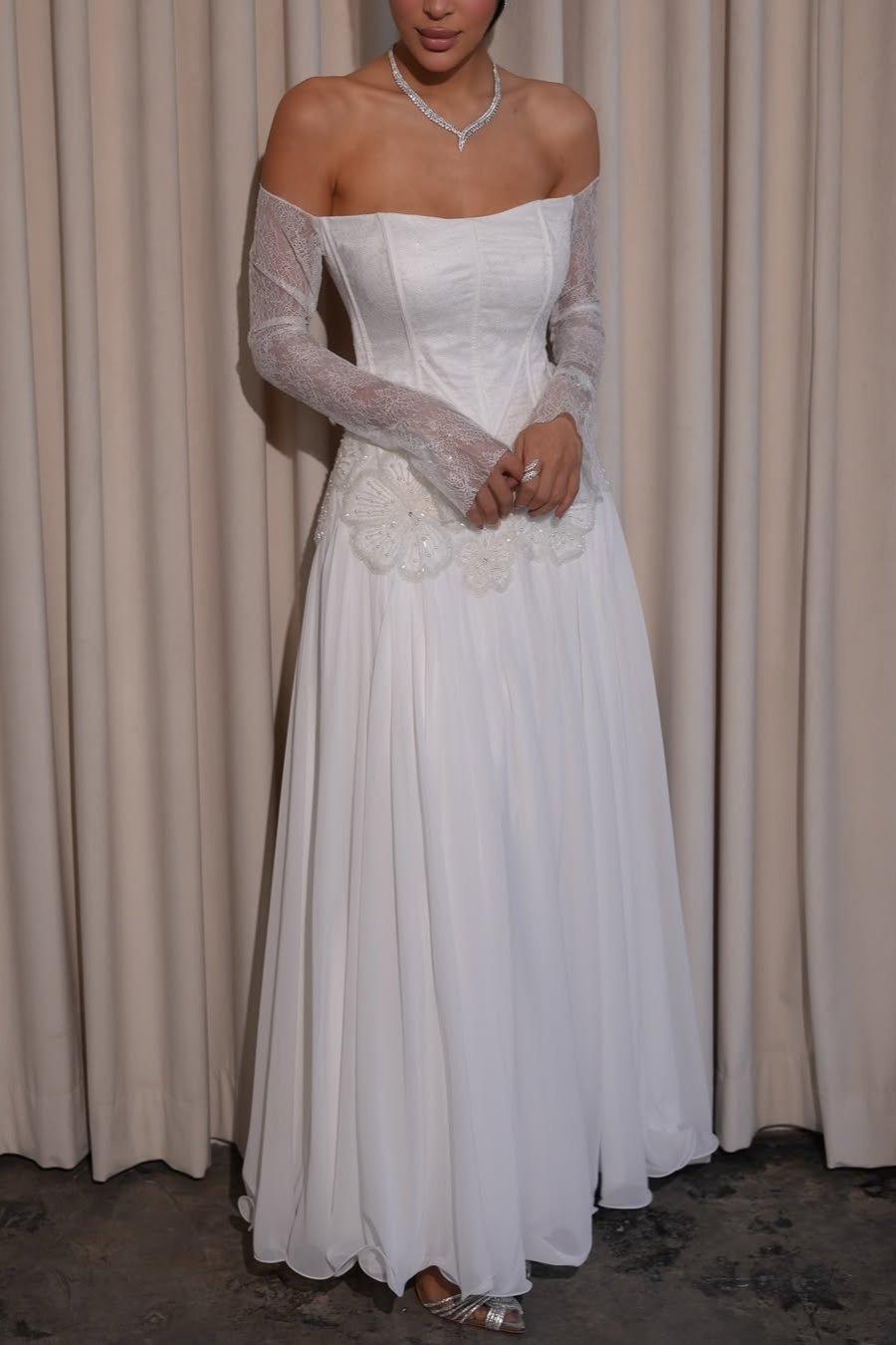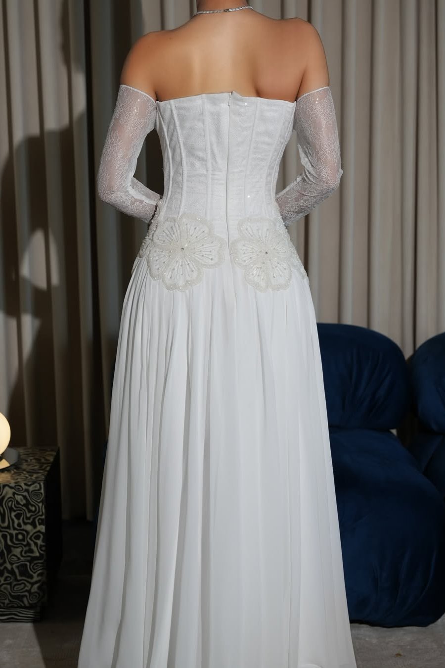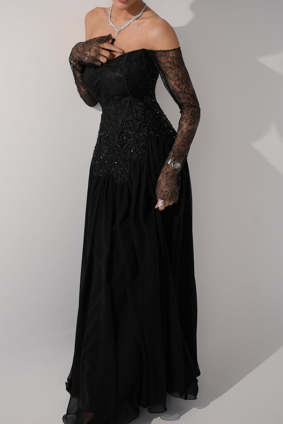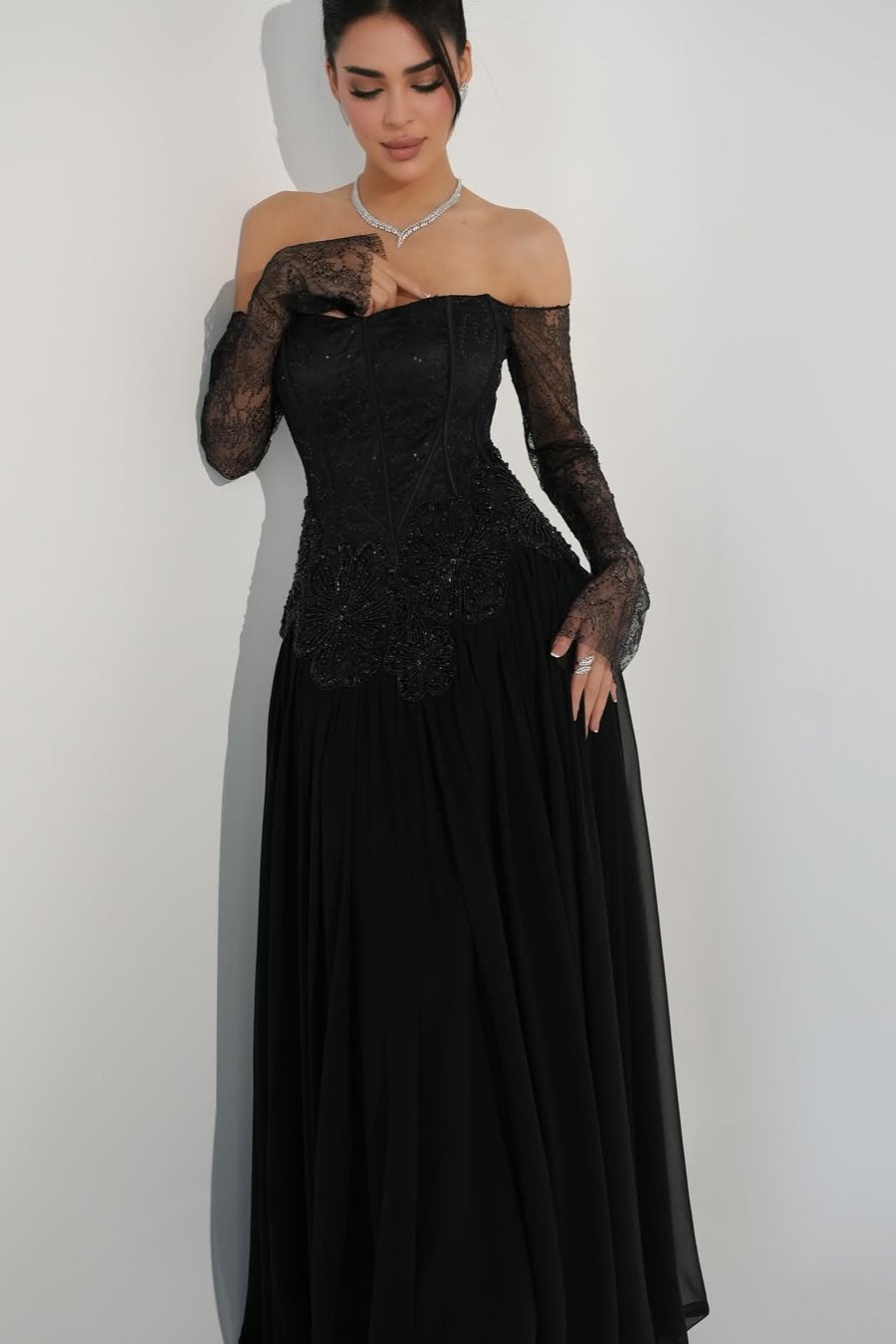 فستان سهرة طويل بخصر كورسييه وأكمام دانتيل