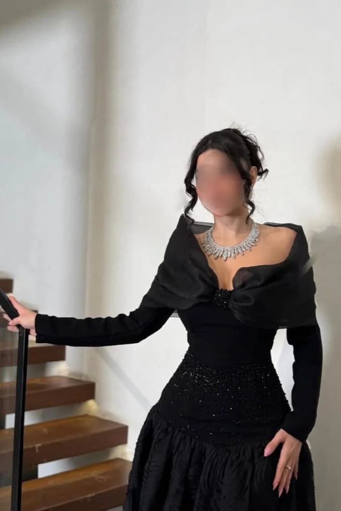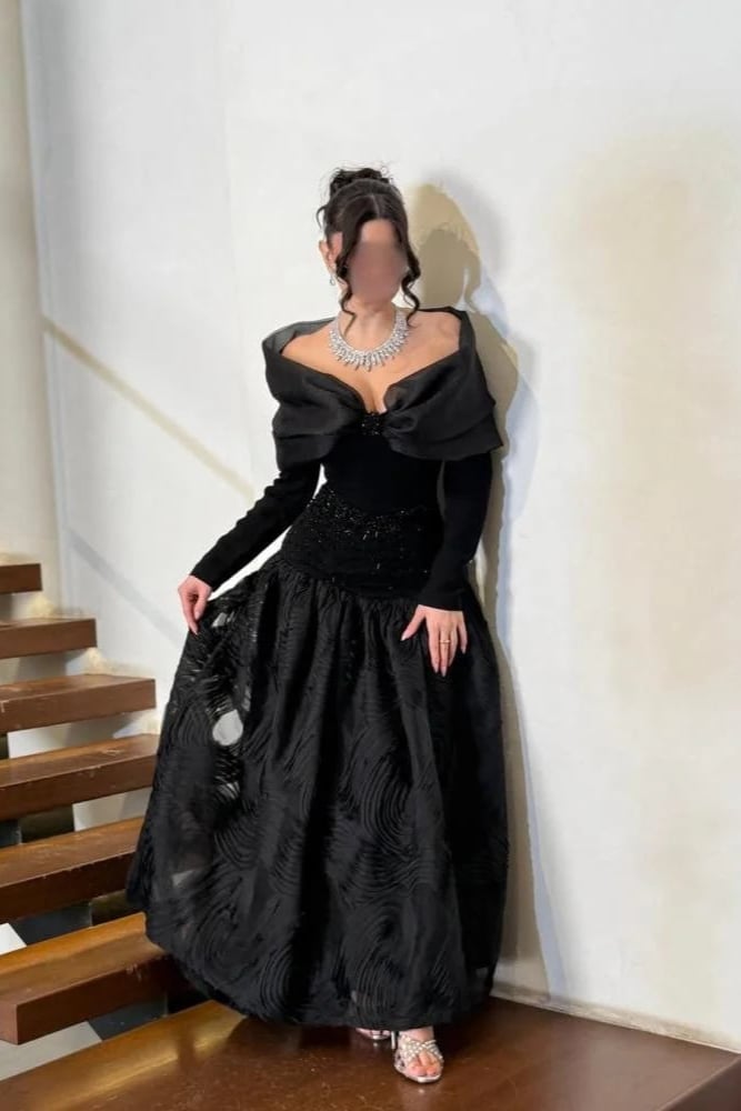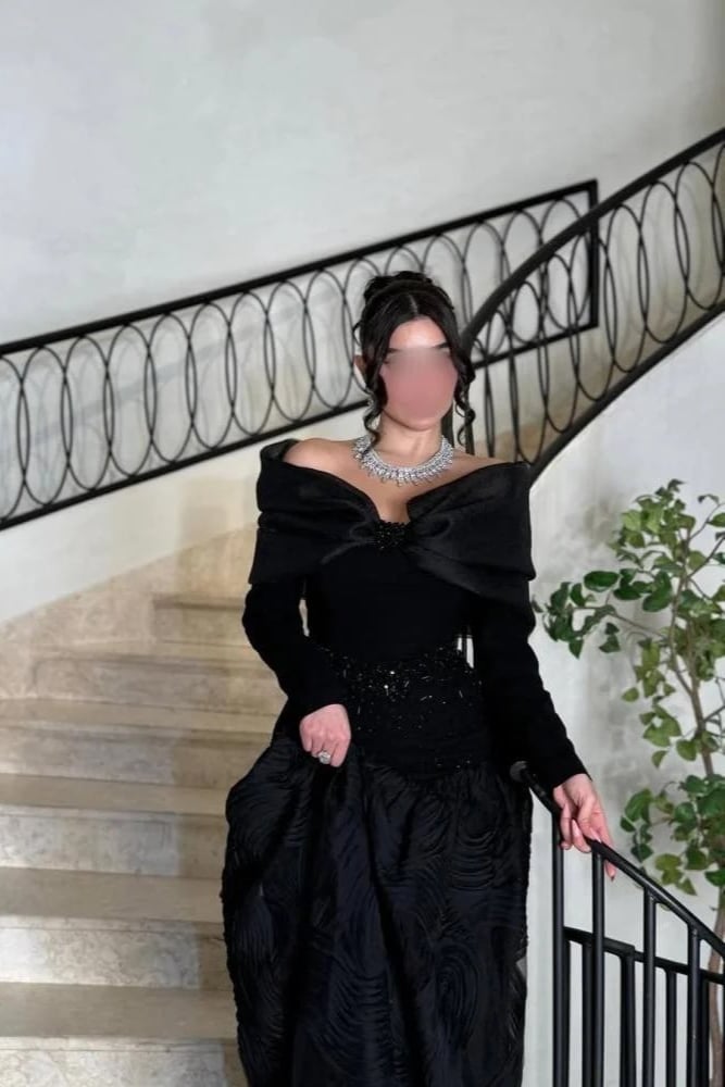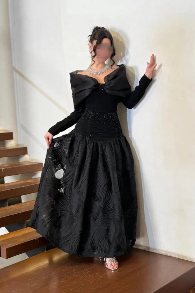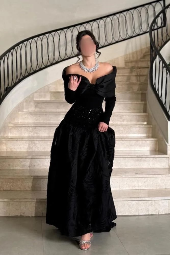 فستان سهرة أسود طويل أوف شولدر مطرز بأكمام طويلة