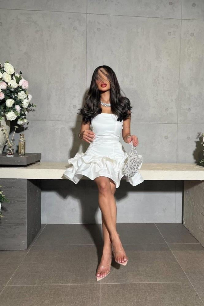 فستان قصير بدون أكمام بقصة أنيقة تبرز القوام بأسلوب جذاب. يتميز بتصميم واسع في الجزء السفلي مع لمسات من الكشكش، مما يمنح إطلالة حيوية تناسب السهرات والمناسبات الخاصة.
