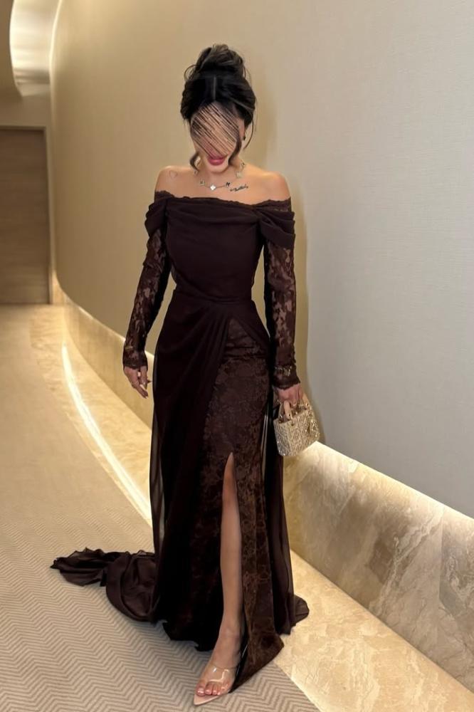 فستان نسائي أنيق من الدانتيل وأكمام طويلة من الدانتيل براقة وأنثوية. تتميز بقصة مدمجة على الكتفين، مما زاد من الإطلالة.