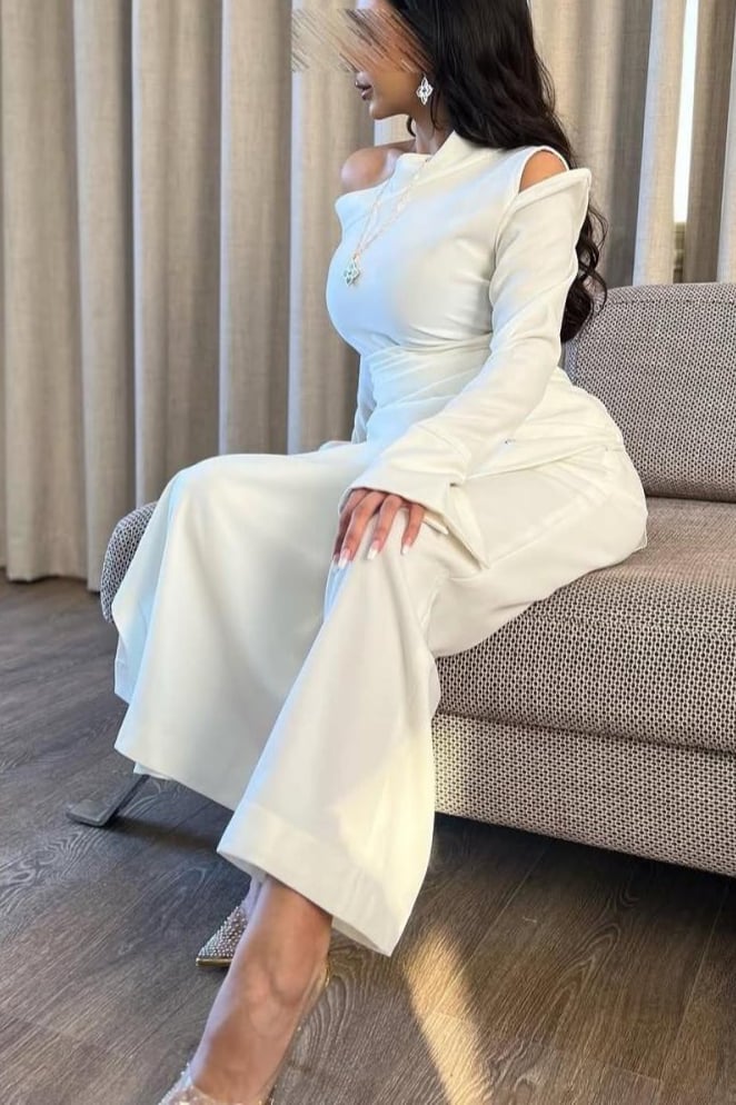 جمبسوت سهرة أبيض طويل بكتف مكشوف وأكمام طويلة