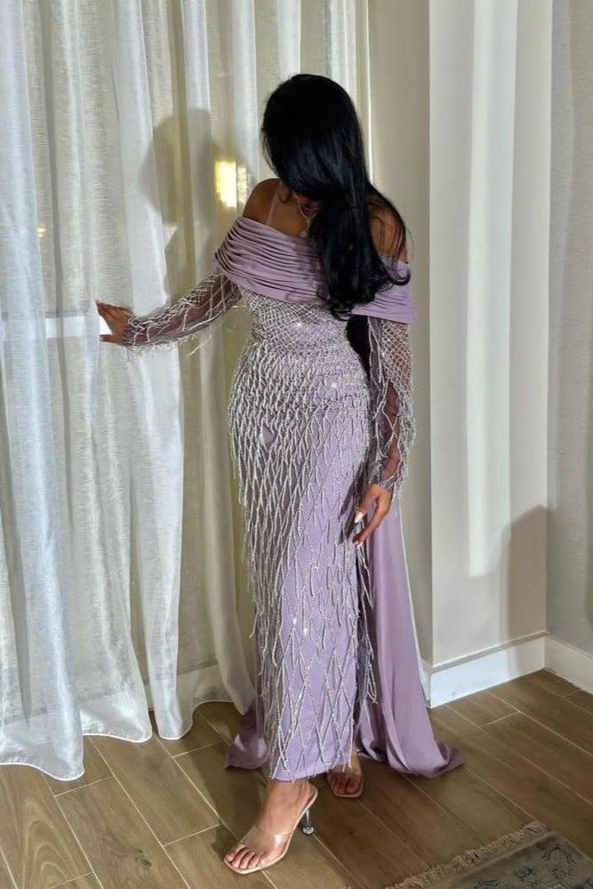فستان سهرة أنيق باللون البنفسجي الفاتح، يتميز بتصميم أنثوي فخم مع أكمام شفافة مزينة بتطريز لامع يضفي لمسة من الفخامة.