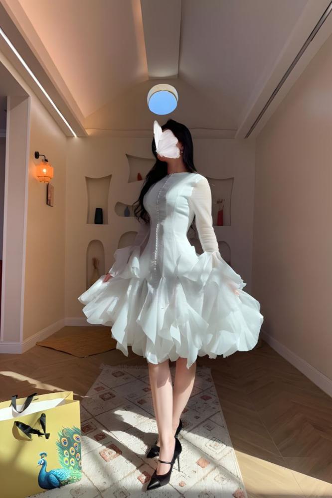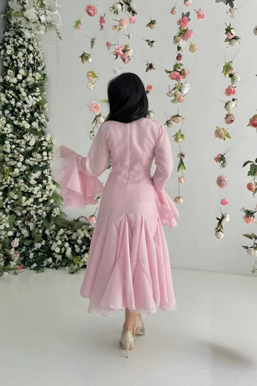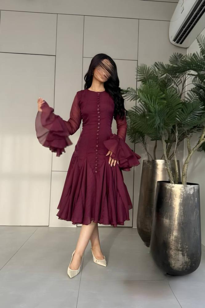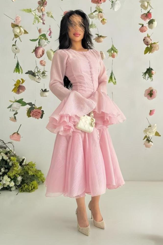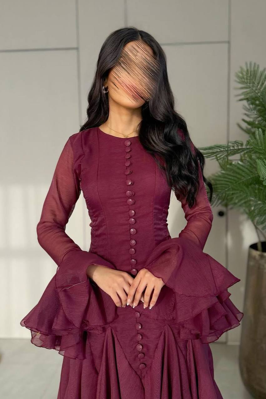 يتميز بأكمام واسعة ذات كشكش جذاب يمنح إطلالة فاخرة. مثالي للمناسبات الخاصة والسهرات الراقية.