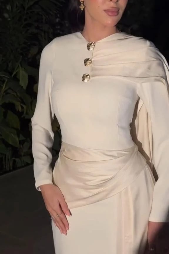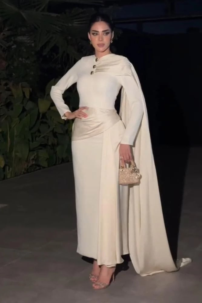 فستان سهرة أبيض طويل بأكمام طويلة وتصميم ملكي