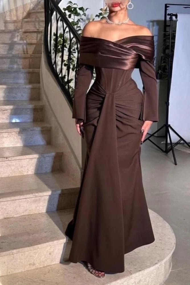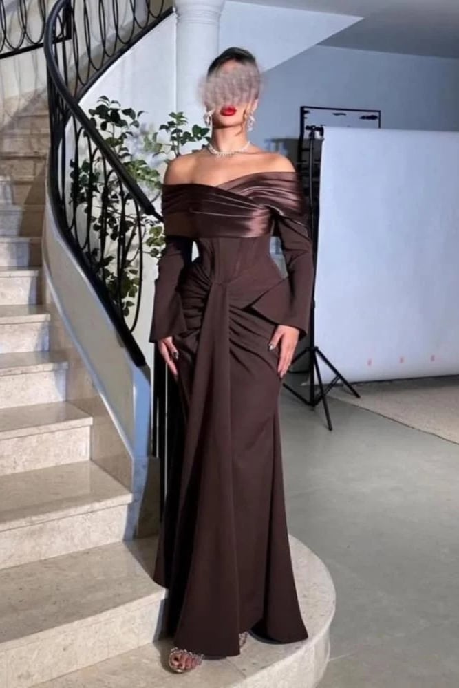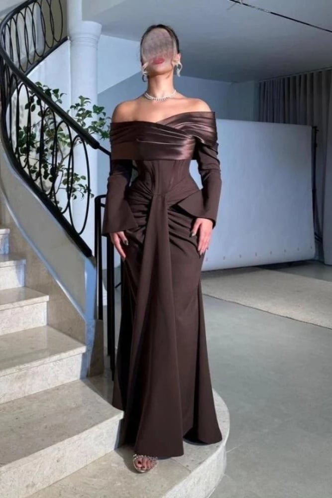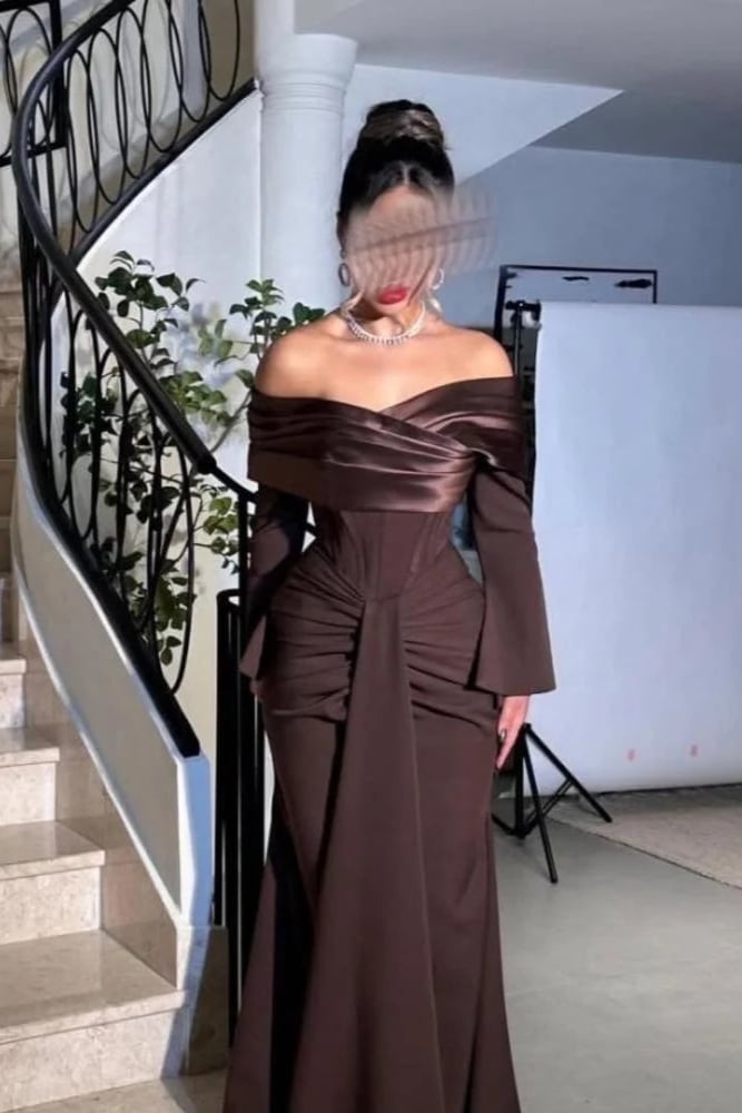 فستان سهرة بني طويل بأكتاف منسدلة