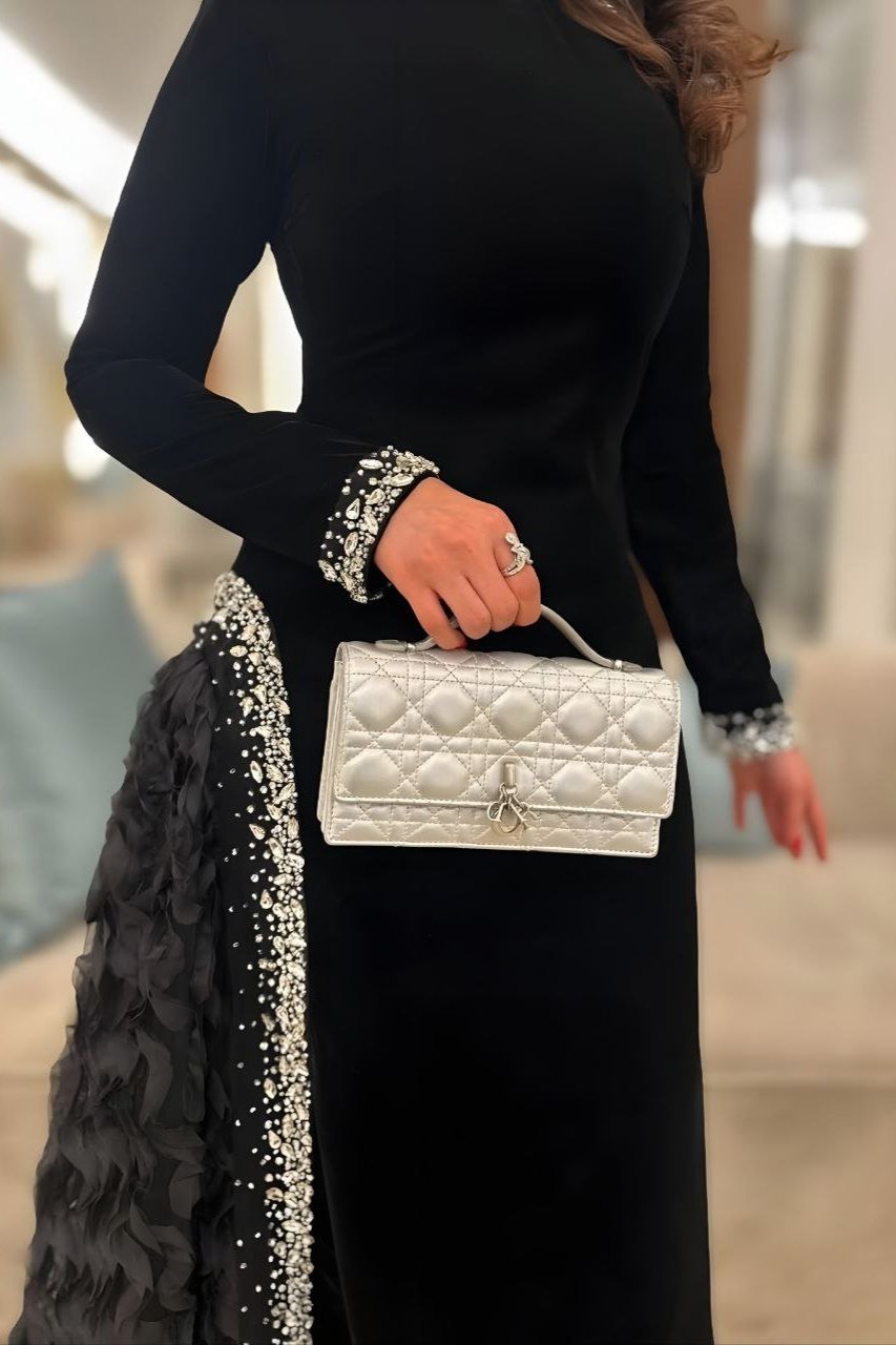 فستان سهرة مخمل أسود بأكمام طويلة وتطريز كريستالي وذيل مزخرف