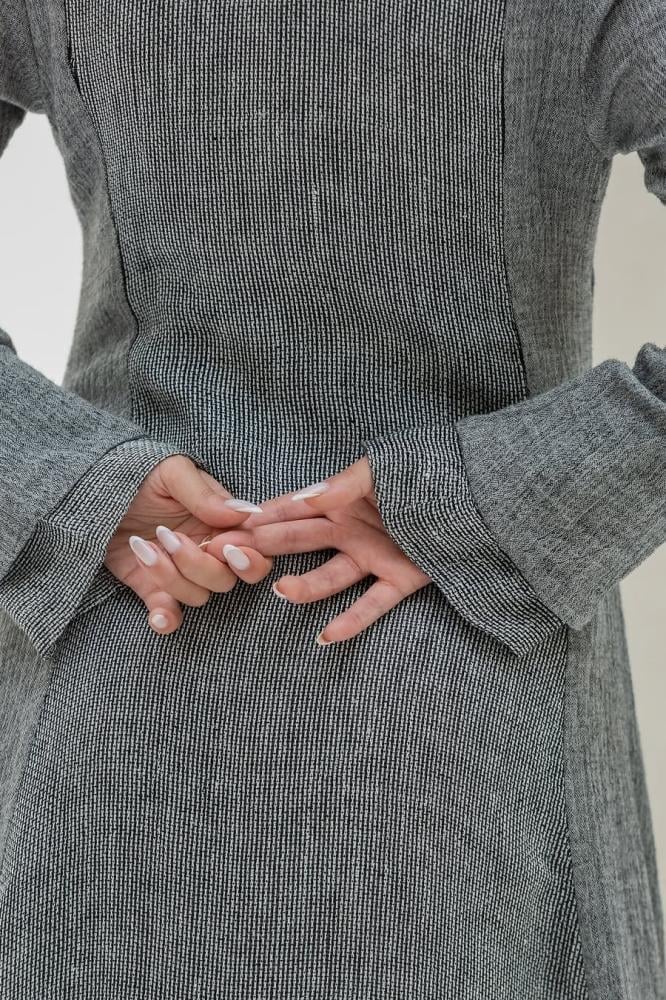 إطلالة راقية بفستان طويل بأكمام طويلة وتصميم عصري بلمسات كلاسيكية.