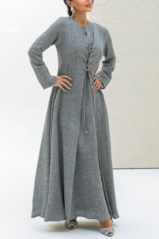 يتميز بربطات أنيقة عند الصدر تضيف لمسة أنثوية ناعمة، مع قصة واسعة تمنح راحة وأناقة في آنٍ واحد.