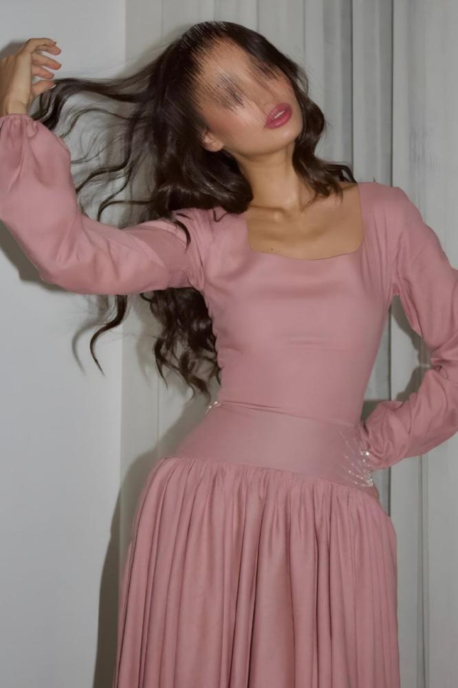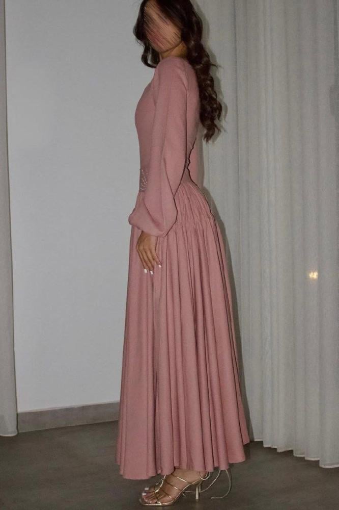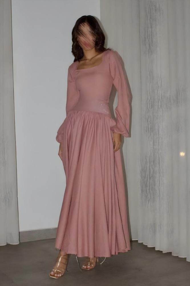 مع أكمام منفوخة تضيف لمسة أنثوية راقية. التصميم الناعم والتفاصيل البسيطة تجعله خياراً مثالياً للمناسبات الخاصة والإطلالات المحتشمة.