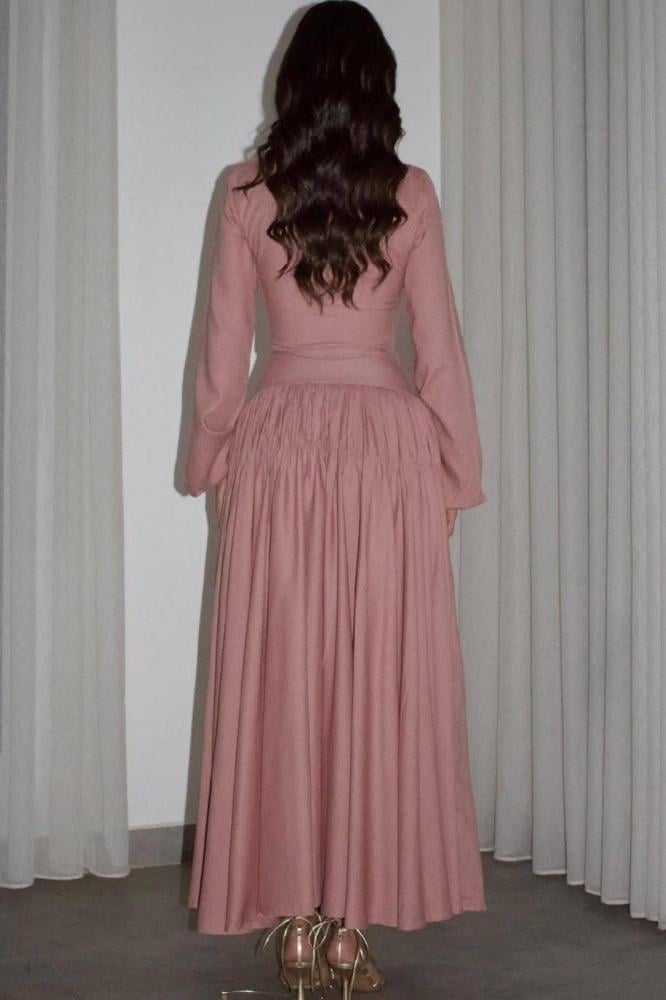 فستان ساحر بتصميم طويل يمنحك إطلالة ناعمة وأنيقة، يتميز بقصة خصر محددة تبرز جمال القوام،
