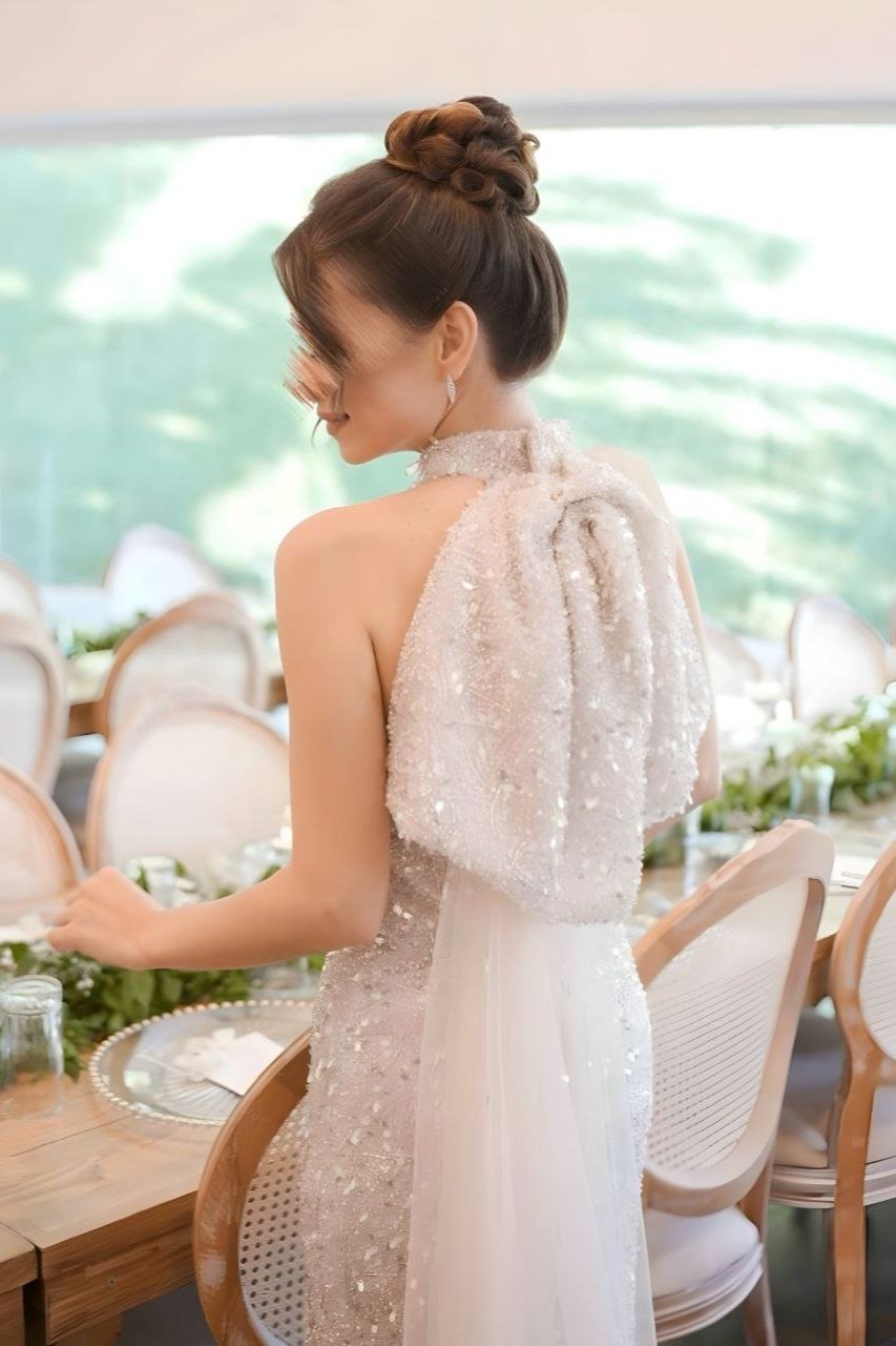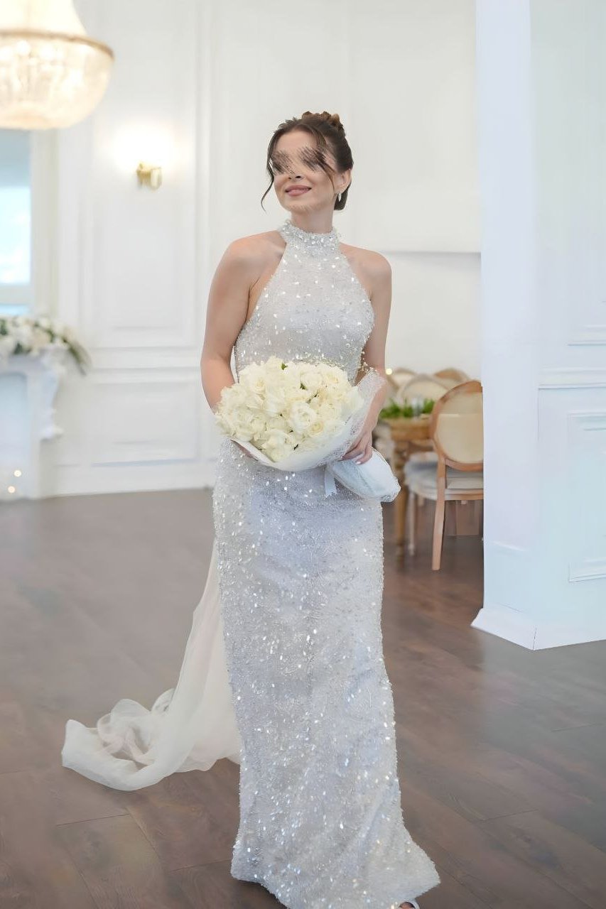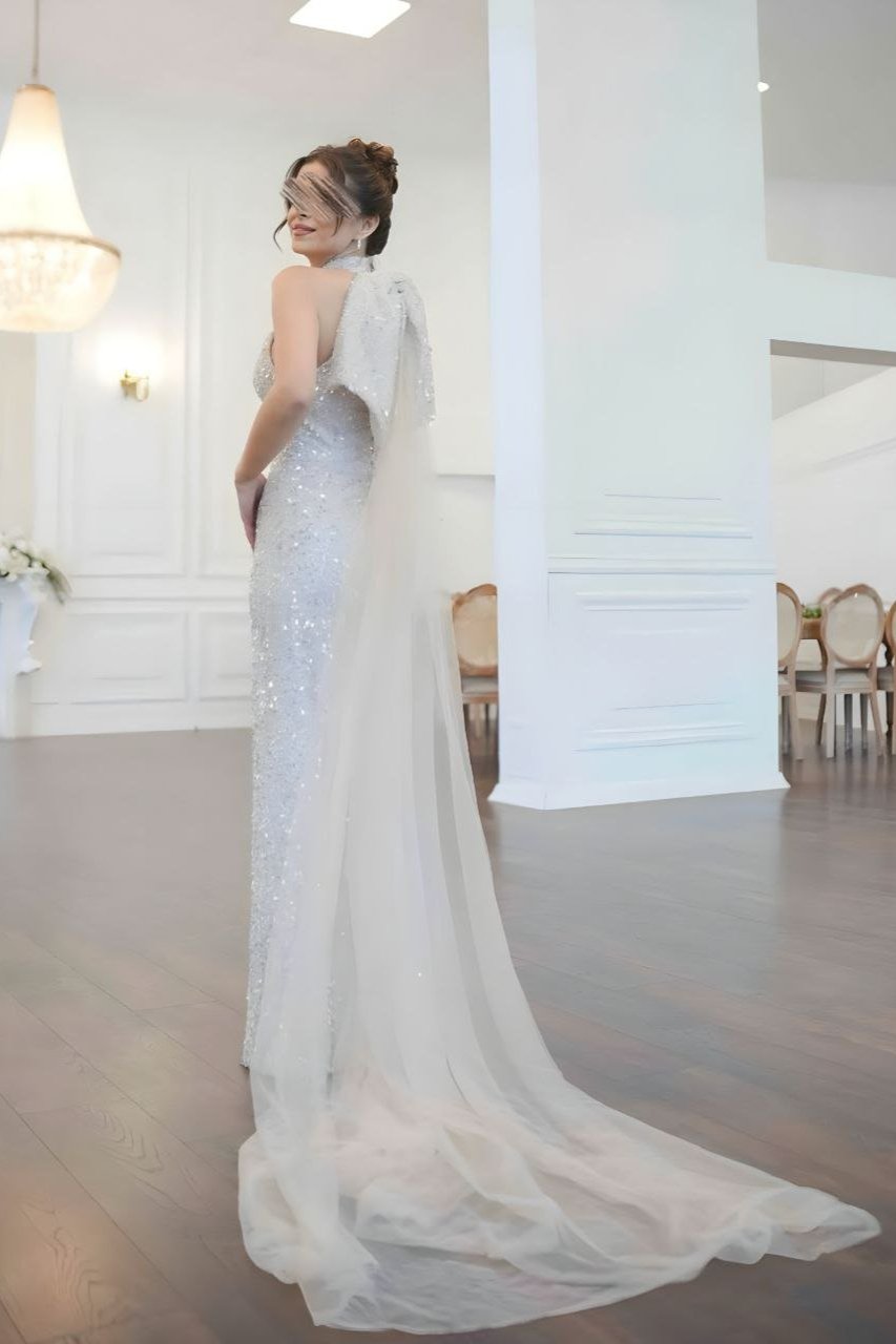 فستان سهرة ملكي فضي طويل بترتر لامع وياقة عالية بدون أكمام مع ذيل شيفون